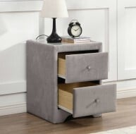 Kilkenny Silver Locker, a stylish and functional statement piece. The sumptuous velvet material and silver shade add glamour to your decor. Two drawers with silver handles provide ample storage. A removable plastic-top table adds versatility. Arrives fully assembled for convenience. Upgrade your bedroom with us.